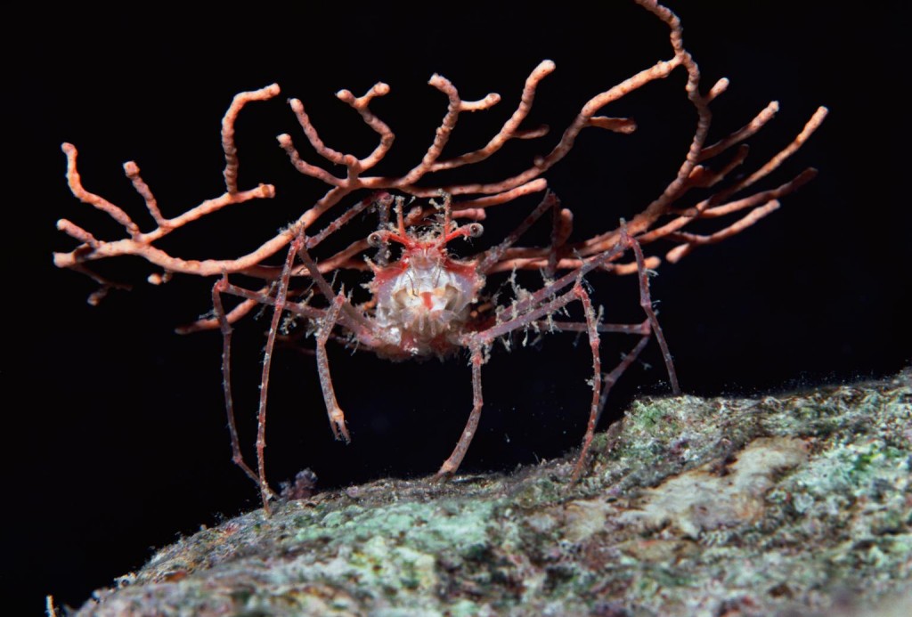 這種螃蟹的殼上覆蓋著像魔鬼氈一樣的毛,能夠幫助牠們將海草、海綿、海葵、珊瑚和其他物品粘在背上。如此一來,螃蟹就能融入背景或者看起來像是另一個物體,生態學家稱這種策略為假冒。