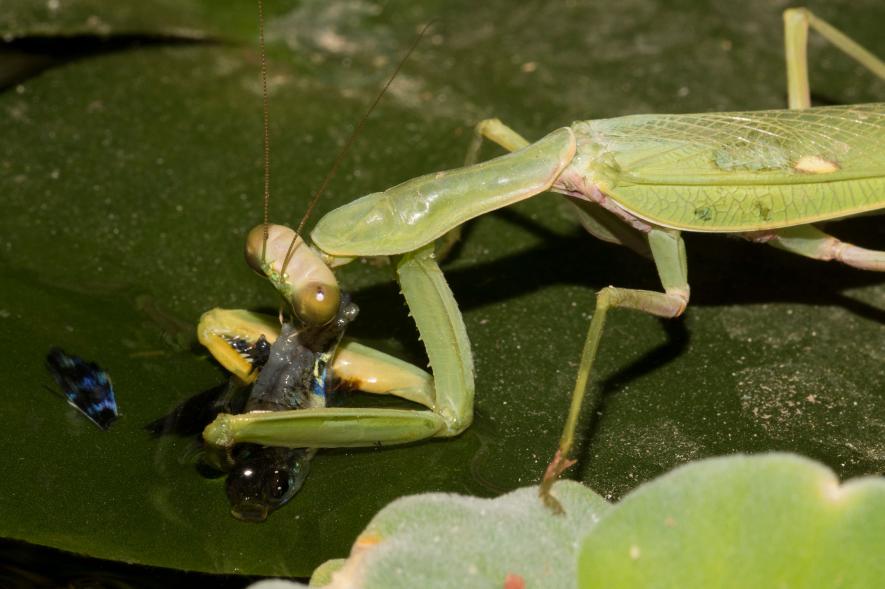 這隻螳螂會踩著浮在水中的睡蓮走到池子中央,將水芙蓉的葉子作為他的抓魚平台。牠會耐心等待某隻孔雀魚悠游到水面附近,然後猛然將牠致命的前肢伸入水中,電光石火之間便將戰利品擒來。