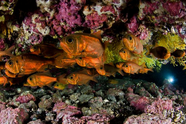 躲在一起:智利臀棘鯛躲在某個珊瑚洞穴內。這種魚是德斯溫特德群島(現為新設海洋保護區)和胡安.費爾南德斯群島(德斯溫特德往南750公里)的特有種。Photograph by Enric Sala, National Geographic