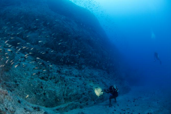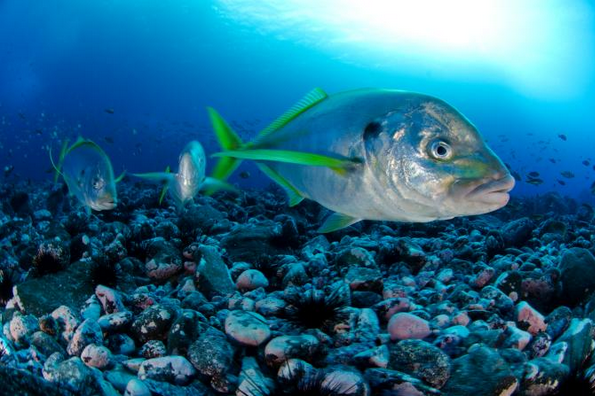 好奇:2013年的德斯溫特德考察行動中,有幾條智利擬鯵往攝影機靠近。這種魚是本區的特有種,也就是說在別處找不到這種生物。Photograph by Enric Sala, National Geographic