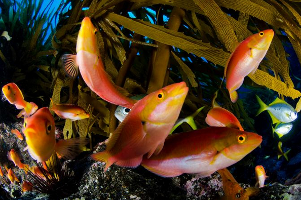 節慶魚:五彩繽紛又華麗的蓋伊擬隆頭魚在一叢海草前繞圈圈。Photograph by Enric Sala, National Geographic