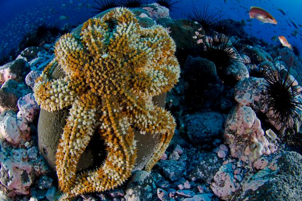 巨型掠食者:海膽豎起的棘刺也威嚇不了這隻海星。在聖安布羅焦島附近,海星是海膽主要的掠食者,這座島嶼是組成德斯溫特德群島的兩大島之一。Photograph by Enric Sala, National Geographic
