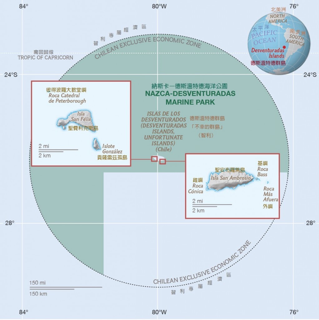 這片海洋保護區形狀像電玩「小精靈」,涵蓋聖安布羅焦島和聖費利克斯島周圍約29萬7000平方公里的海洋。兩座島嶼合稱為德斯溫特德(即西班牙文「不幸的」)群島,屬於海底納茲卡洋脊的一部分,這條洋脊從祕魯的西南方延伸到復活節島。
