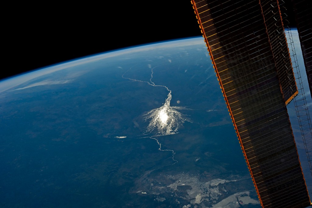 從國際太空站拍下的景象中,一年一度的洪水淹沒了波札那的內陸綠洲——奧卡凡哥三角洲。高空攝影和遙測地圖正以清晰的細節揭露地球的新陳代謝。Photograph by NASA, International Space Station
