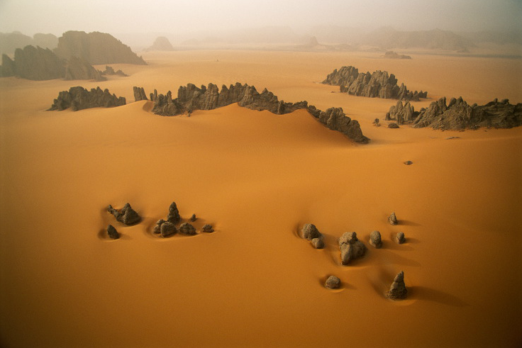 沙岩岩峰矗立於查德境內卡納賽谷(Karnasai Valley)橘色的沙丘上。Photograph by George Steinmetz