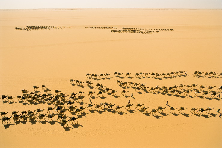 鹽販商隊在尼日境內一望無際的特雷瑟荒漠(Tresert)上交錯而過。Photograph by George Steinmetz