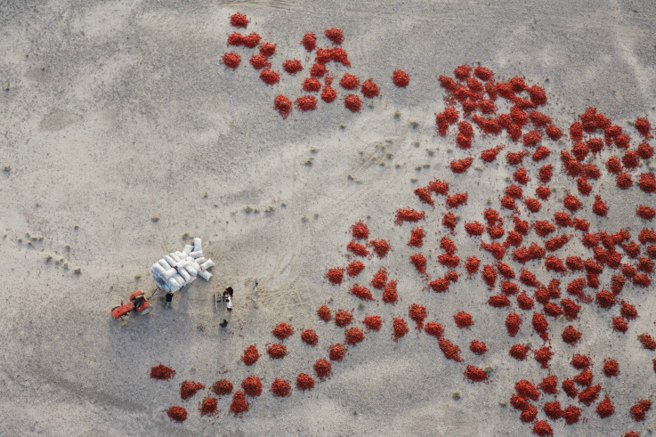 中國新疆拜城附近,一堆堆的紅辣椒攤在地上等著曬乾。Photograph by George Steinmetz