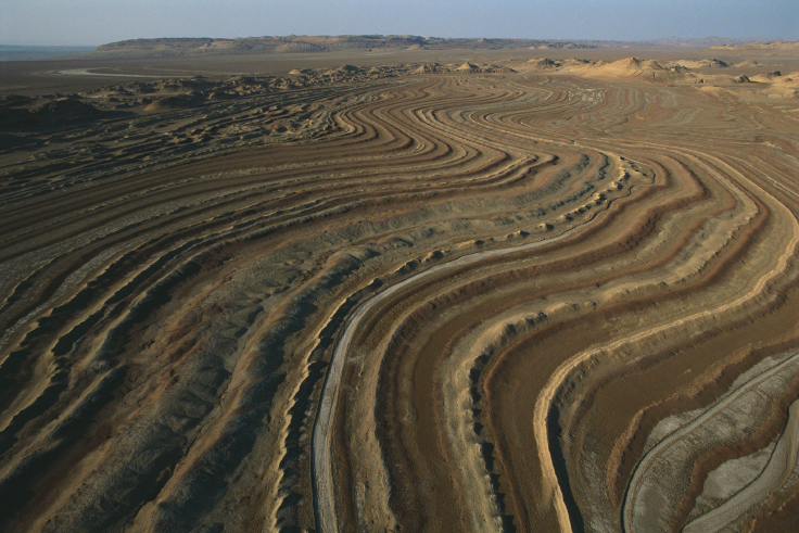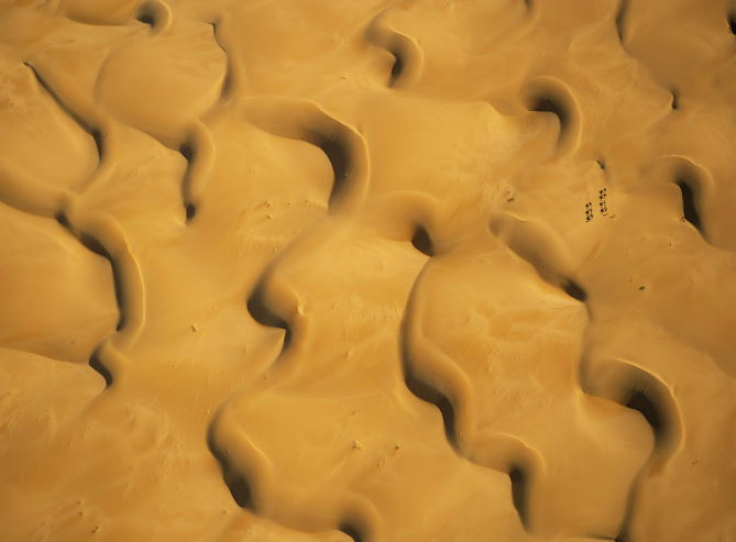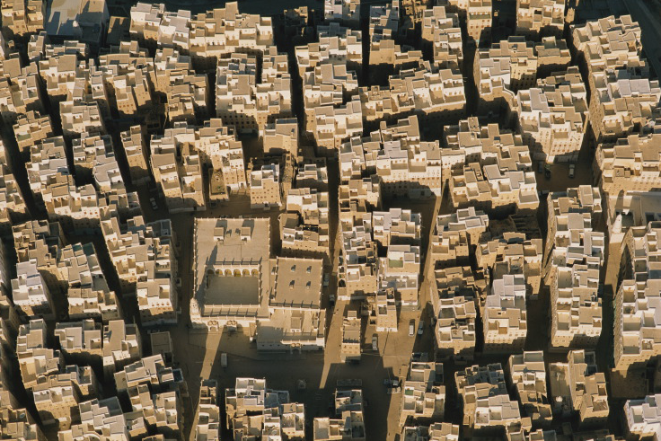 阿拉伯半島魯卜哈利沙漠上空所見,葉門境內古代貿易中心夕班城。Photograph by George Steinmetz