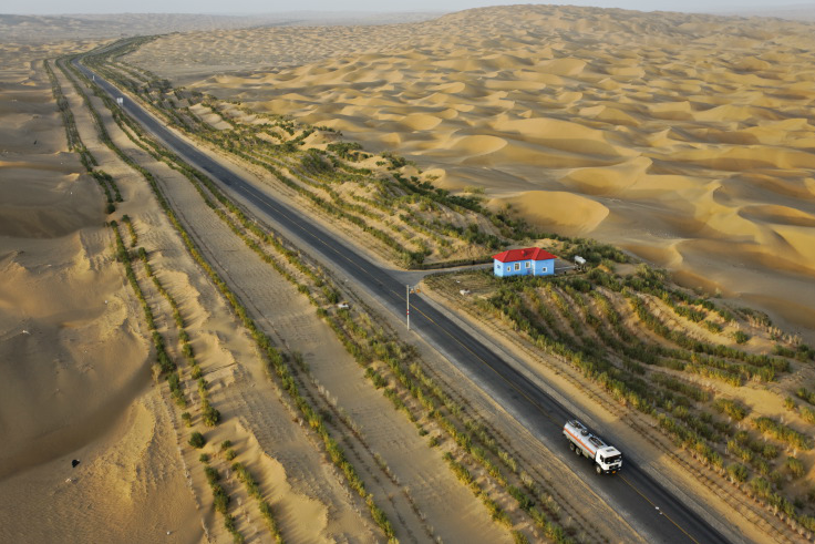 中國境內通往塔克拉瑪干油田的南北縱貫道路。Photograph by George Steinmetz
