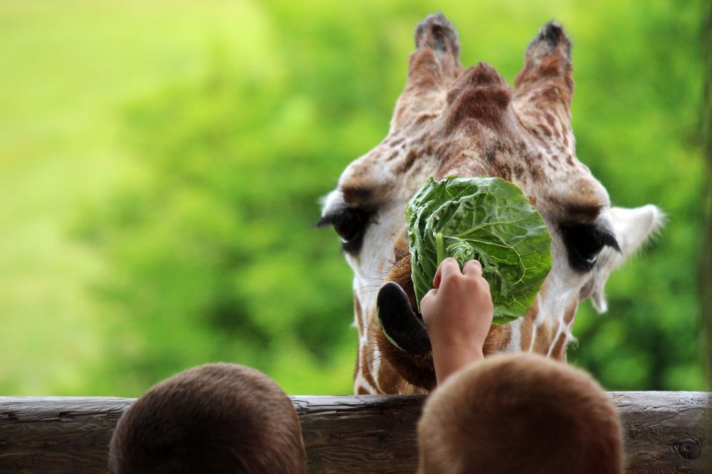 這兩名小男孩正在餵食動物園裡的長頸鹿。他們咯咯笑的聲音真是太迷人了!