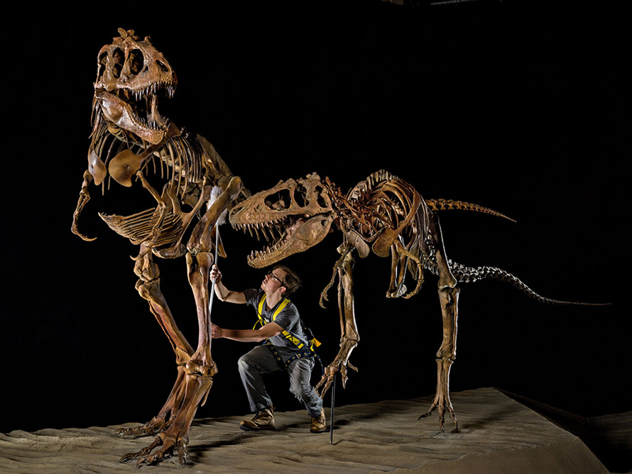 猶他州自然史博物館裡,傑佛瑞.李奧納德為一隻成年及一隻幼年的怪獵龍(Teratophoneus)撢去身上的灰塵。牠們和體型稍大的親戚霸王龍(Tyrannosaurus rex)一樣,很可能是凶猛的捕食者。