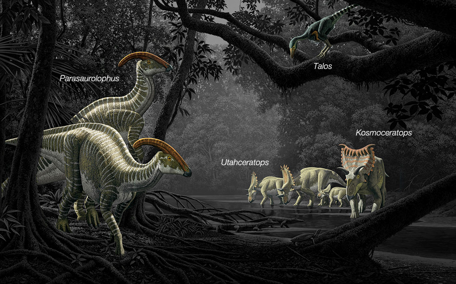 7700萬年前,角龍和鴨嘴龍這兩種草食性恐龍在位於今日猶他州南部沙漠的一條河流相遇。一種外觀像鳥、稱為塔羅斯龍(Talos)的肉食性獸腳類恐龍則在樹上觀看。當時在拉臘米迪亞古陸上支持這麼多物種共同生存的地方,樣貌可能和現今路易斯安那州北部的亞熱帶溼地很類似。