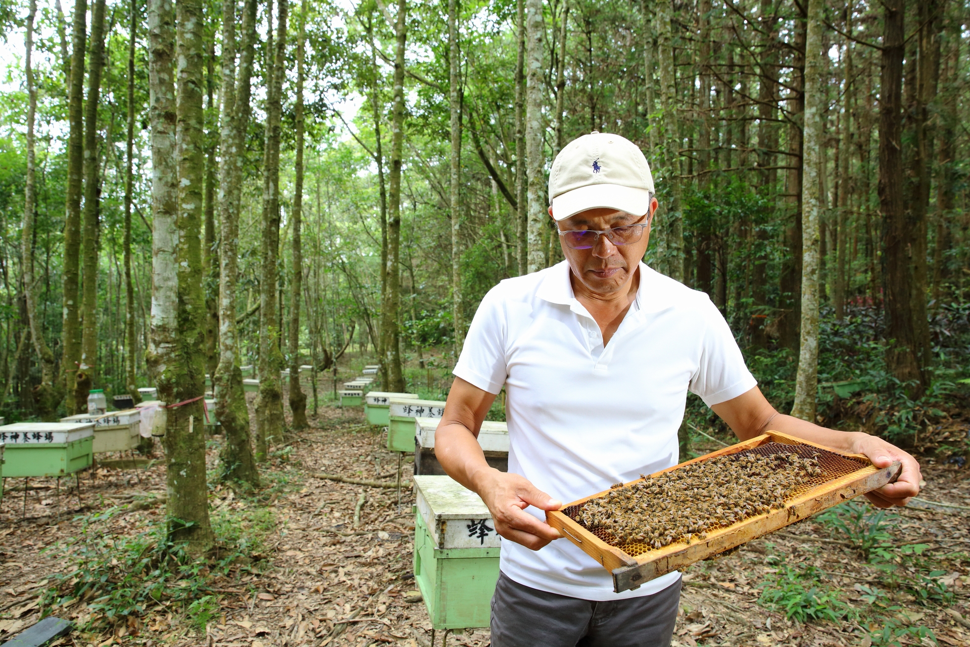 ▼放置在林試所蓮華池分所這片印度栲試驗林下方的蜂箱,按照蜜蜂的生命週期,每一個星期都需要檢視照顧。王智聰說,林下養蜂在碰到森林中開花的植物較少的季節時,若不餵食,蜂群就會劣化,蜜蜂數量減少,這是他對照實驗後的結果,證實了林下養蜂並非放著就有源源不絕的蜂蜜可以採收。他則是選擇在開花淡季時不採蜜,為蜜蜂留下存糧。