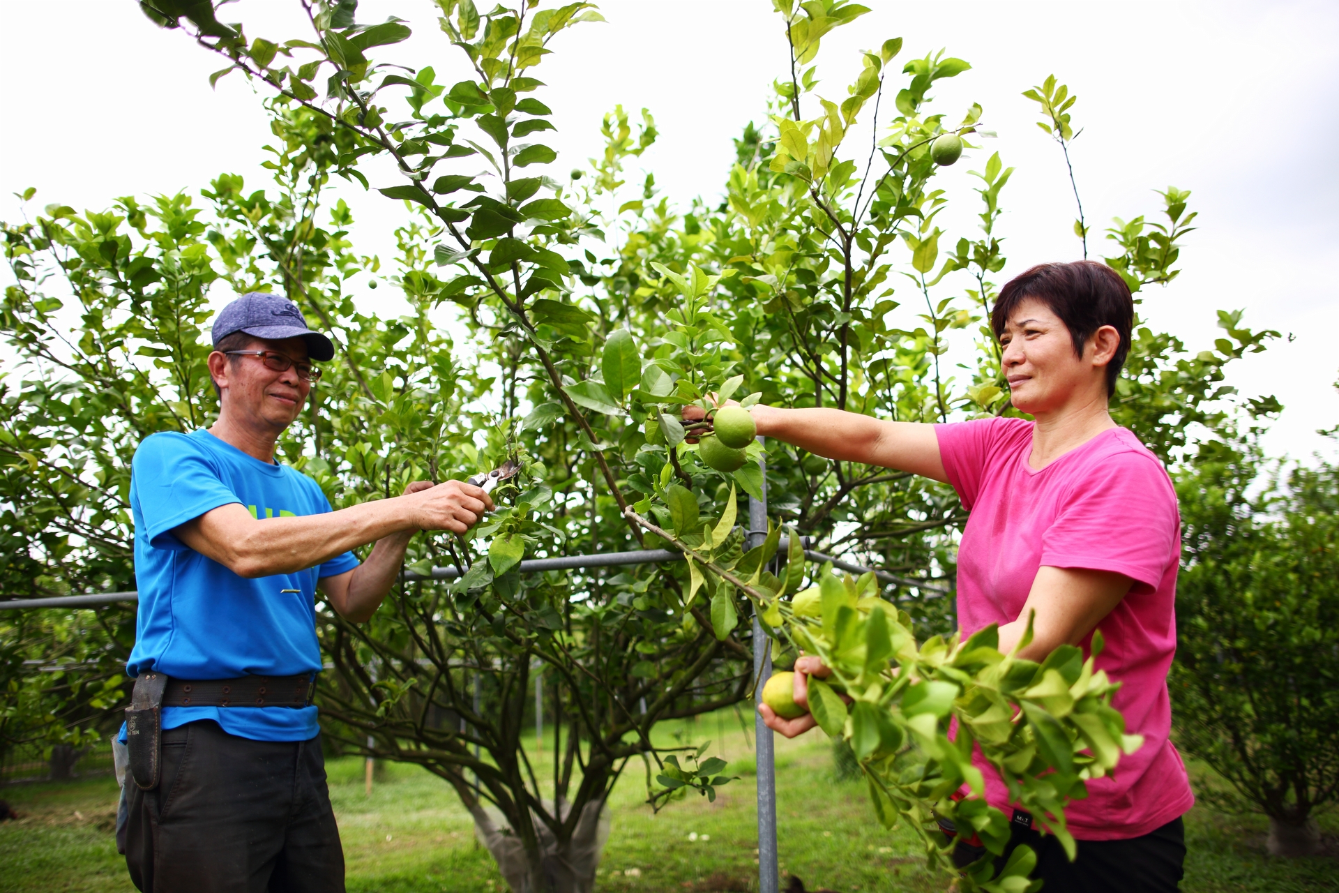 ▼貞心有機農場主人楊淑貞在先生的協助之下,開心地採集自己種植的有機檸檬。楊淑貞自製有機酵素液肥來補充地力及養份,也減少病蟲害發生。檸檬的營養價值、美味及附產品加工運用,頗受國人喜愛,不過有機檸檬果樹的生育時間較長,種植不易,常遭椿象、天牛等病蟲危害,其種植難度較短期作物為高,所耗費的人力、資材成本也較慣行農法高,但楊淑貞認同健康、無毒的有機農業理念,樂在其中。