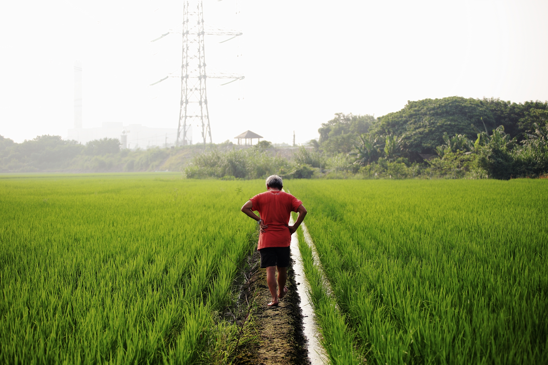 ▼鍾兩福赤腳走在土堤田梗上,巡視他以自然農法友善環境耕作的稻田,由於不施化學農藥,雜草與稻田交雜而生,看來有種野生農地的樸拙感。友善環境耕作乃農耕過程符合環境友善、不使用合成化學物質、基因改造生物及其產品之耕作方式,可說是從慣行農法轉型至有機農法的過渡方式。