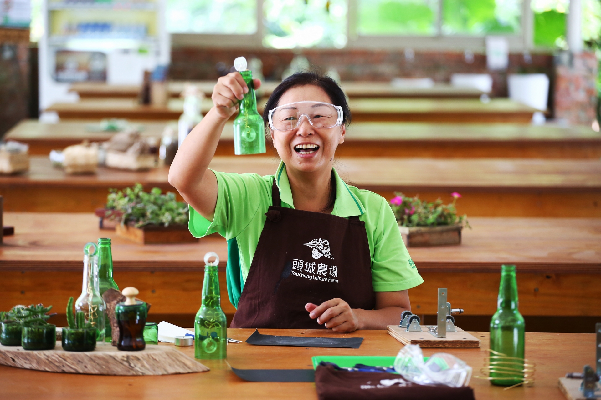 ▼頭城農場董事長秘書莊幼惠原本為設計師,因為喜歡山林潛水等自然生活,來到農場在體驗教育區教導前來農場體驗的民眾,如何善用廢棄資材製作各種實用又美觀的創意生活品。