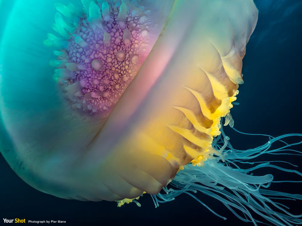 攝於南非東岸帝王花海堤暗礁(保護區資格待審核)。這是我看過最大的水母,紫首黃身的搭配令人驚艷。當時水中沒有任何可作為比例參照的物體,不過我真希望這隻皇冠水母的豔彩、巨身與宛如身處烈燄中的優雅動感,能進一步在成立保護區之後,為大家愛護、推崇。(本作品來自〈你的觀點〉,同時收錄於每日精選App中20160708圖集。)