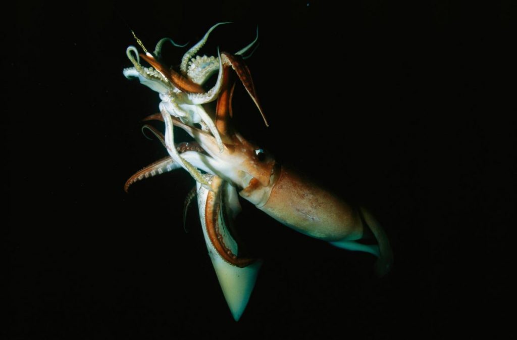 一對加州灣的巨魷魚邊游泳邊抱接(Amplexus)。【譯註:抱接(Amplexus)是指在交配行為中,雙方抱合在一起的動作,常見於兩生類,不過在頭足類甚至部分無脊椎動物也可以見到。】PHOTOGRAPH BY BRIAN SKERRY, NATIONAL GEOGRAPHIC CREATIVE