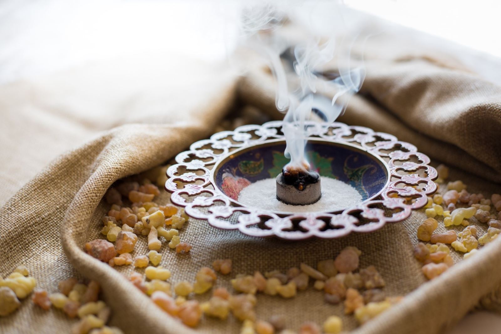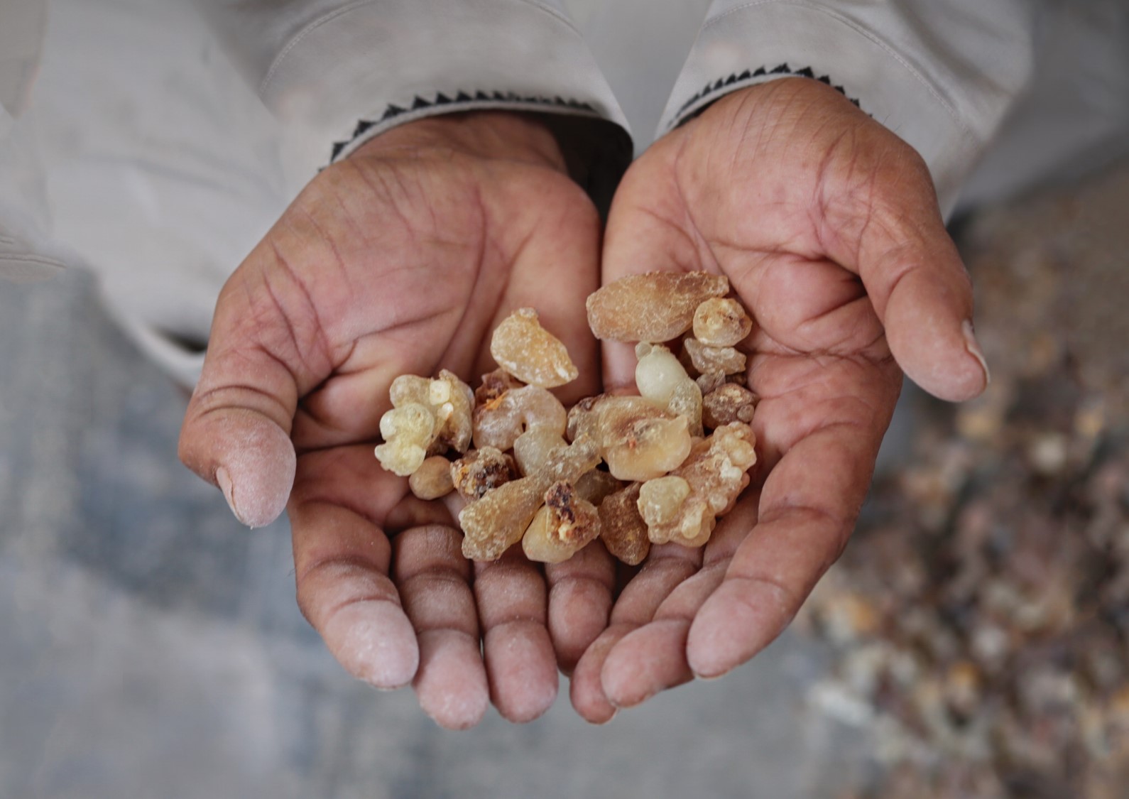 乳香的採集方法是在乳香樹皮上劃開幾刀,流出的乳狀汁液在接觸空氣後會變硬,成為白黃帶微紅的半透明凝塊,即為乳香。簡單來說,乳香是一種芳香樹脂,主要產地包括肯亞和索馬利亞一帶乾燥的沙漠,以及葉門、阿曼等地。尤其是阿曼所生產的乳香,被視為品質最上乘也最為昂貴。