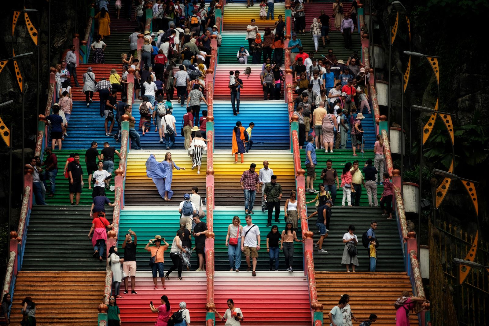 走訪了穆斯林建築及歷史古城,學員們來到印度人在馬來西亞的宗教聖地---黑風洞,以天然石灰岩形成的洞穴興建寺廟與祠堂,參拜的印度人必須經過272階的彩色階梯,才能抵達最頂端黑風洞裡的寺廟。攝影班學員們參訪的這天,正在舉行印度教的贖罪儀式,以銀鉤刺穿肉體、赤腳苦行的方式敬神,對學員們來說是一次記憶猶新、難忘的經驗。