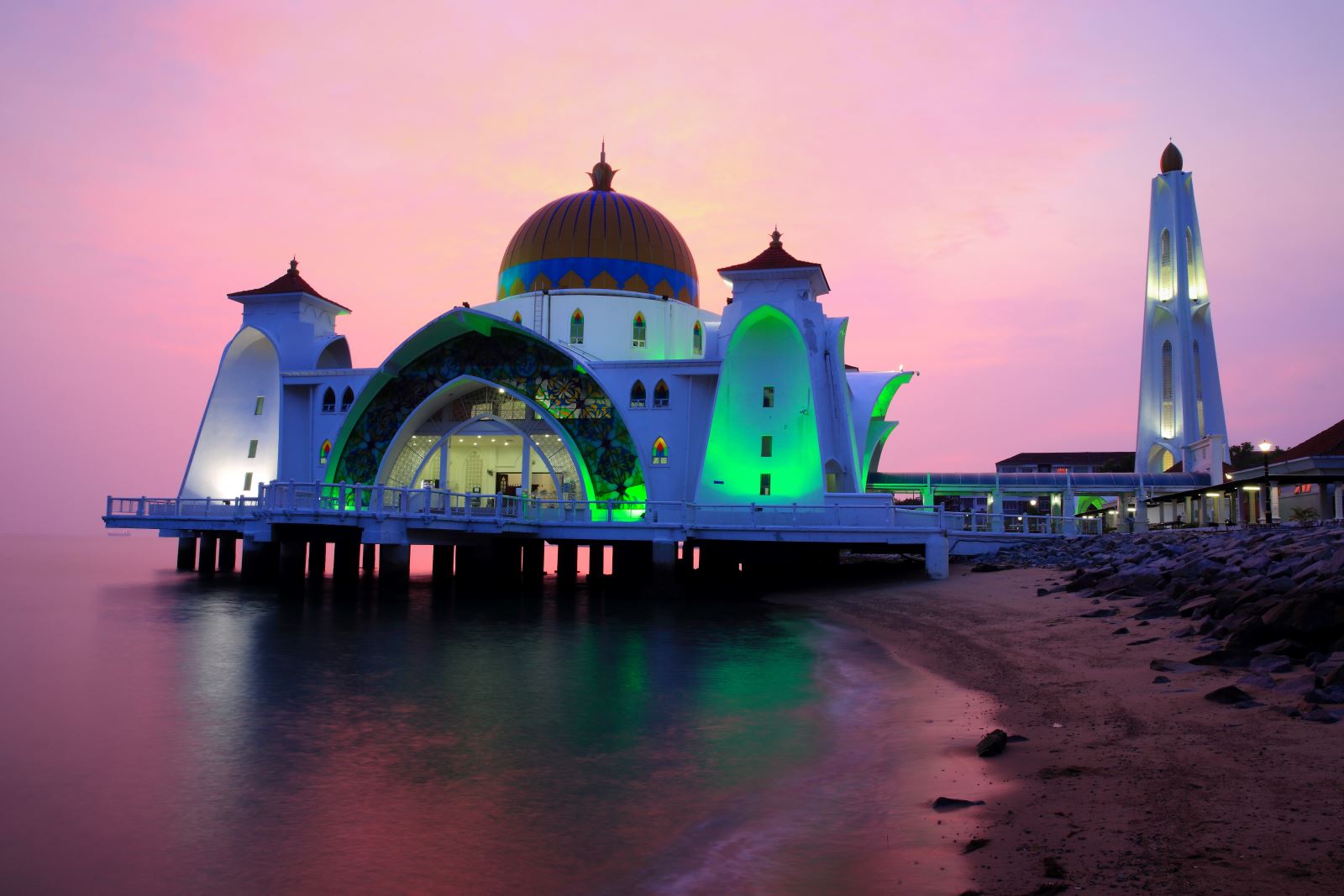 在夜晚,海峽清真寺散發著綠色光芒,與橙粉色的晚霞形成強烈對比,卻意外和諧,猶如馬來西亞的和諧街,印度廟、佛教廟宇、教堂、清真寺比鄰而坐,衝突卻諧和。嘉美克清真寺坐落於吉隆坡發源地,位於巴生河及鵝嘜河交匯處,一座典型的印度穆斯林建築,後方有著吉隆坡地標的吉隆坡塔及各大銀行辦公大樓,新舊融合的景色,像是爺爺與孫子的對話,述說著過去的歷史故事與今朝的繁華。