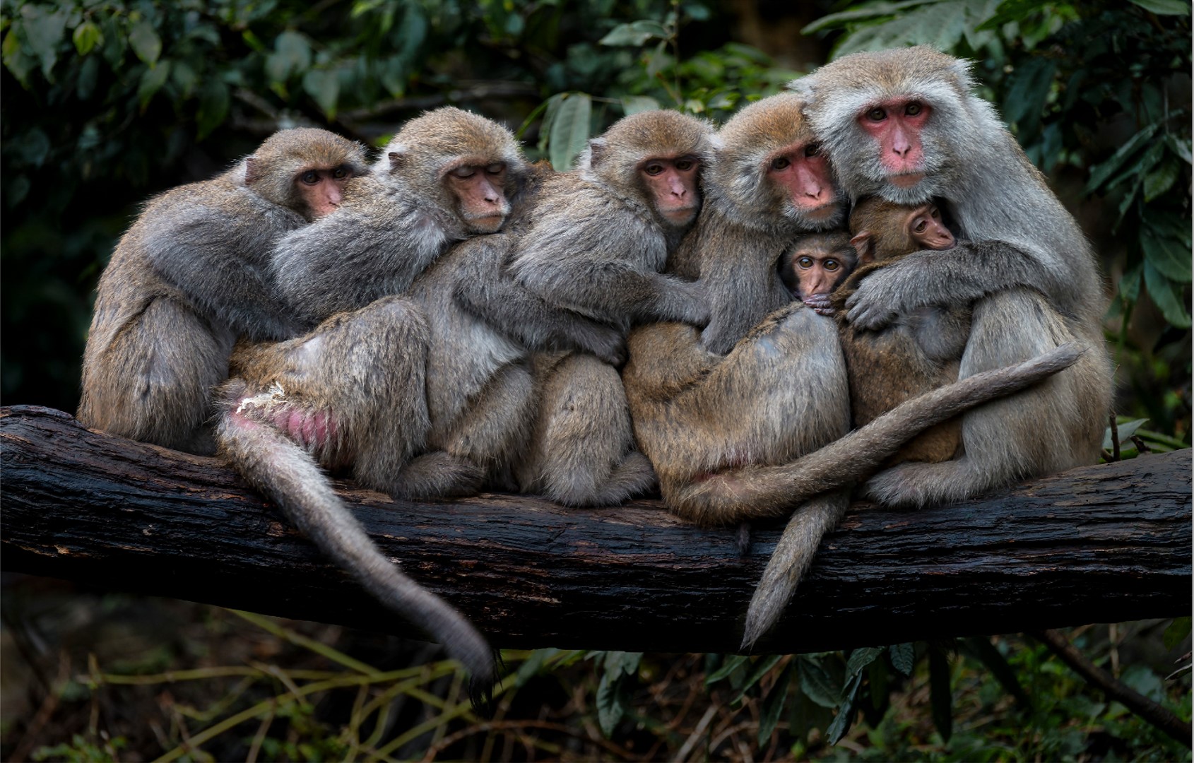 自然組 冠軍〈取暖〉楊宗融:寒流來襲,猴群互相依偎取暖。