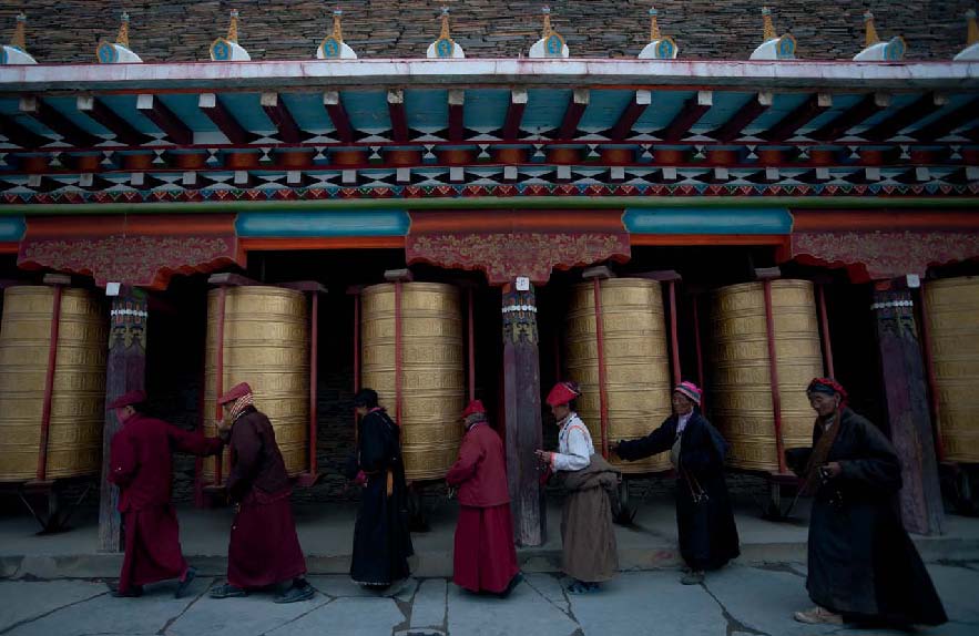 虔誠的信徒一邊「轉山」(繞行寺廟),一邊轉動經輪以求取善報。