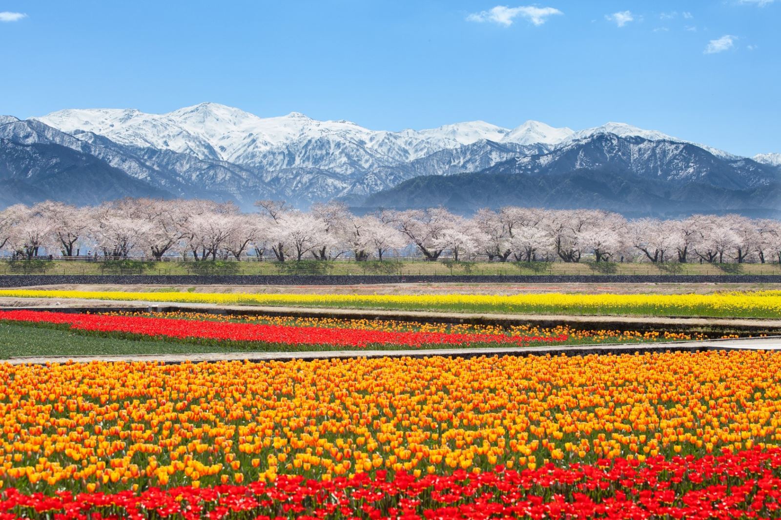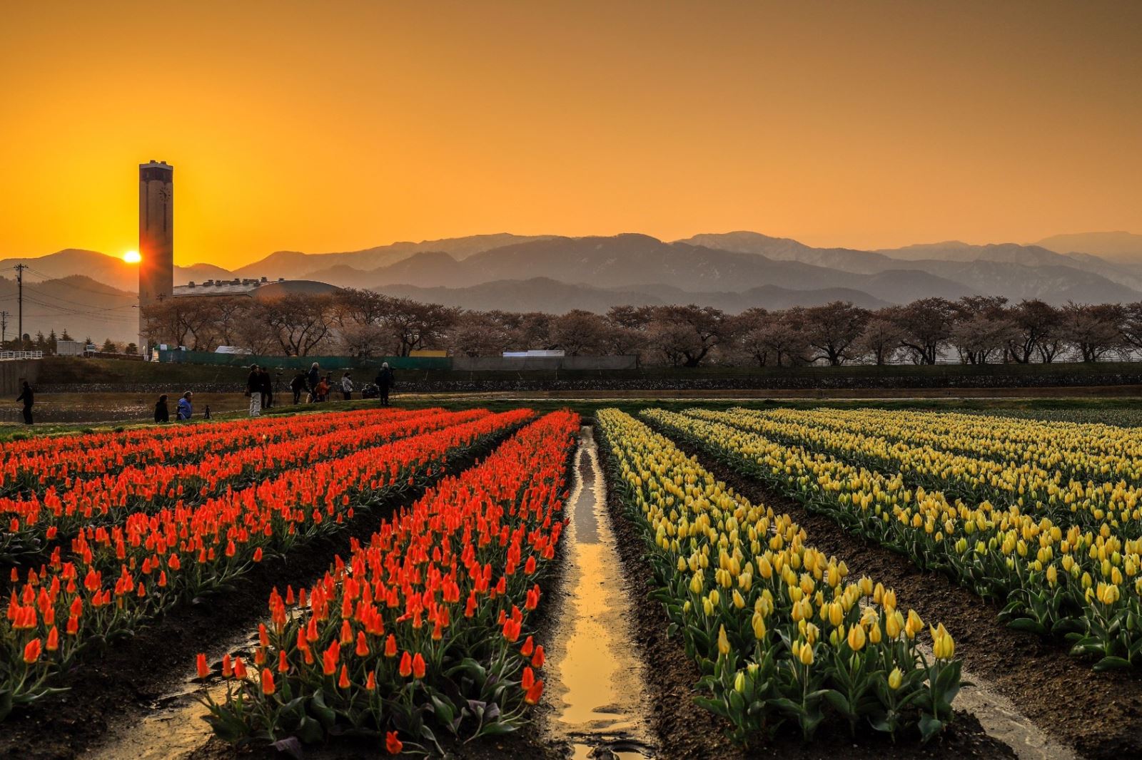 朝日町向來是以農業和漁業為主要經濟來源,每年四月翻土、五月種下稻米,直到次年九月採收,之後便讓農地休養生息,靜待春天來臨。也有些農民會趁著冬季剛結束、播下稻米之前,栽植喜愛涼爽氣候的鬱金香,還有種子可榨油的油菜花。就在這冬春交接之際、短短的一周時間裡,有機會看見三種高度不同、顏色也不同的植物各自盛放,加上背景中積雪尚未融化的朝日岳與白馬岳諸峰,就是天時地利與人和造就的獨特美景。