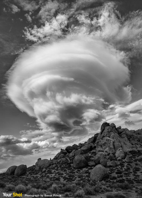 我跟著一群人一同探索內華達山脈的攀岩聖地──Buttermilk Country。當我們愈爬愈高,暴風雲便開始集結,隨之而來的是強風與驟雨。路過這個山丘時,雲團堆積速度很快,幾秒內就變成這巨大的莢狀雲。相較之下,底下的山丘顯得更加矮小。接著,我就架好三腳架,用後背包固定住,免得器材被強風帶走,然後就開工啦!(本作品來自〈你的觀點〉,同時收錄於每日精選App中20160413圖集。)